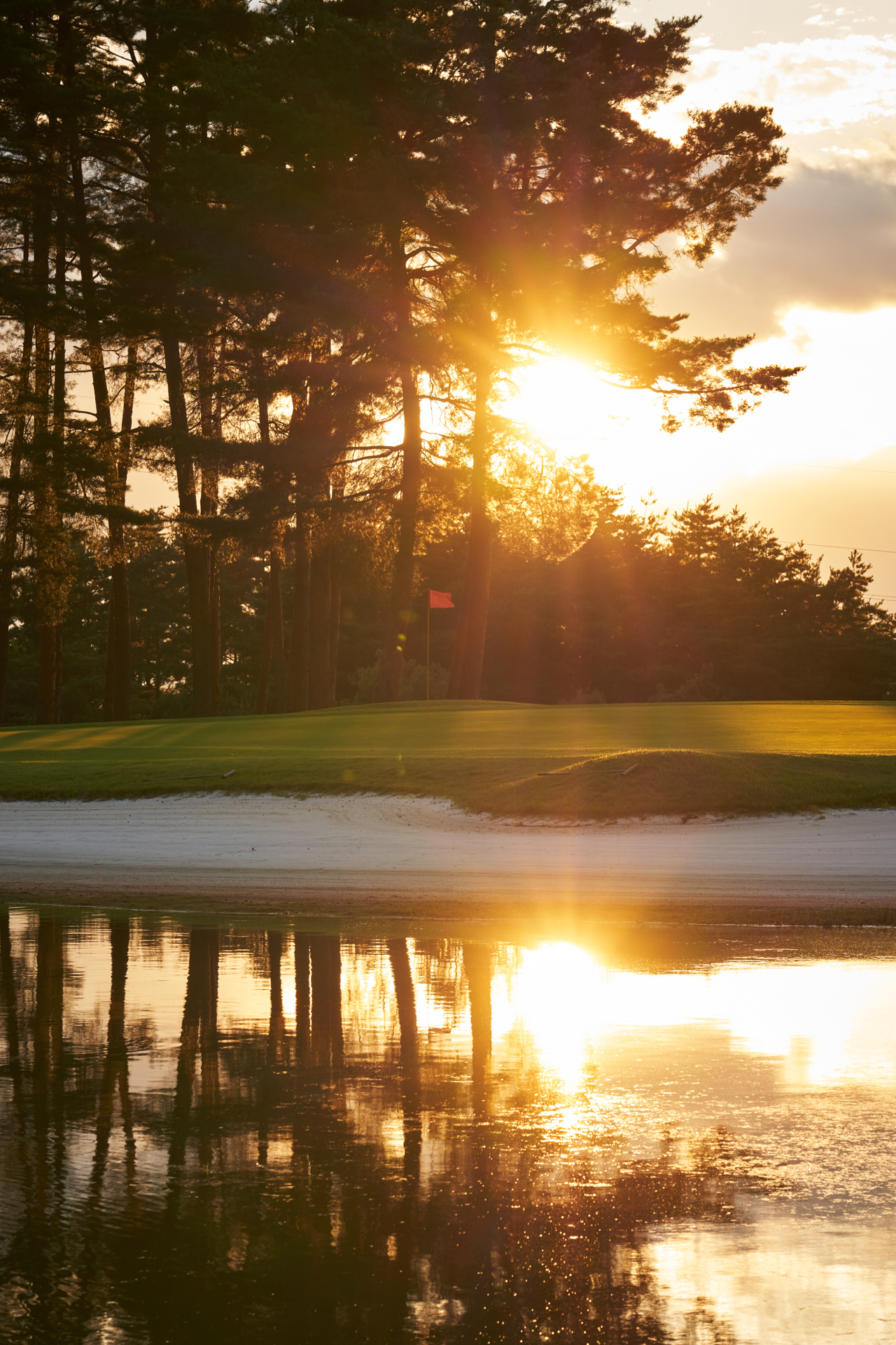フラットな地形ながら、池やバンカーなどのハザードが戦略性を高めており、赤松や白樺などの自然の樹木が残る景観も魅力です。