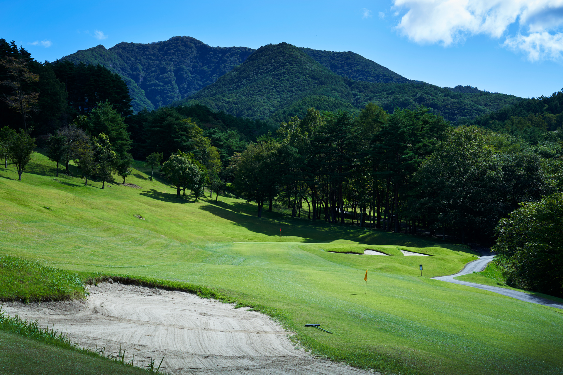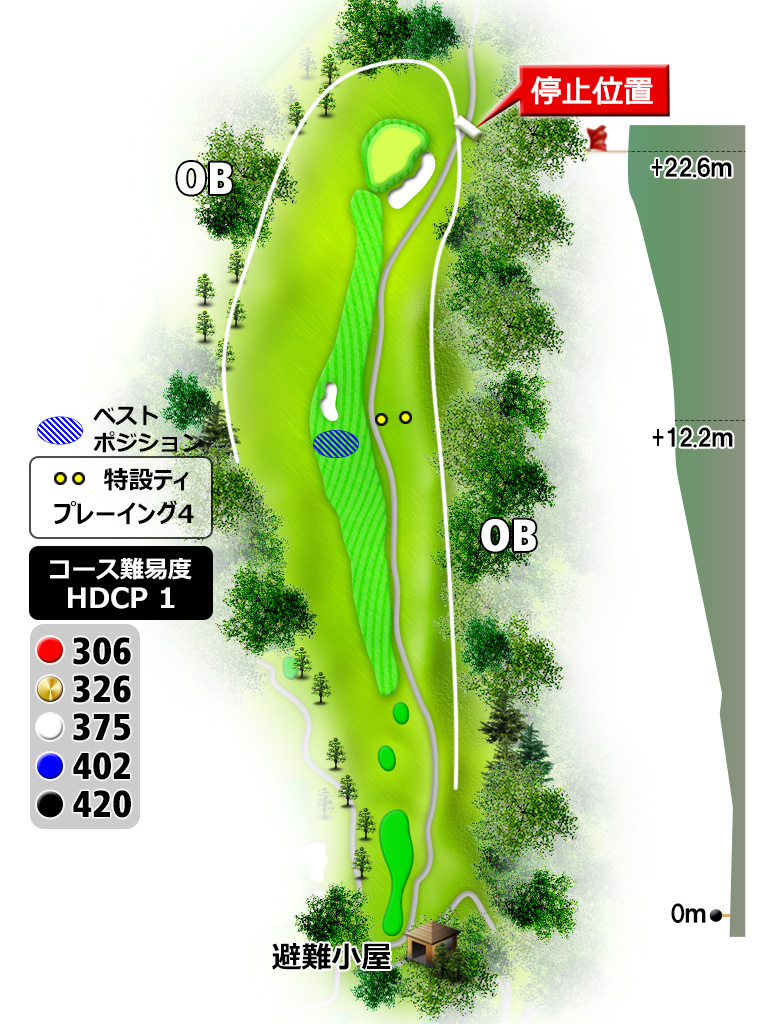 ティーショットは、左サイドが安全。バンカー右側が狙い目。(右はグリーンまでOB。OBの場合は前方特設ティーよりお願い致します。)
