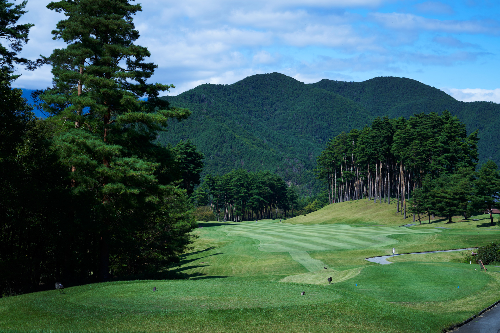 ティーショットは、先行組のカートがフェアウェイを横切ったら、スタンスをチェックし、フェアウェー真中へ。