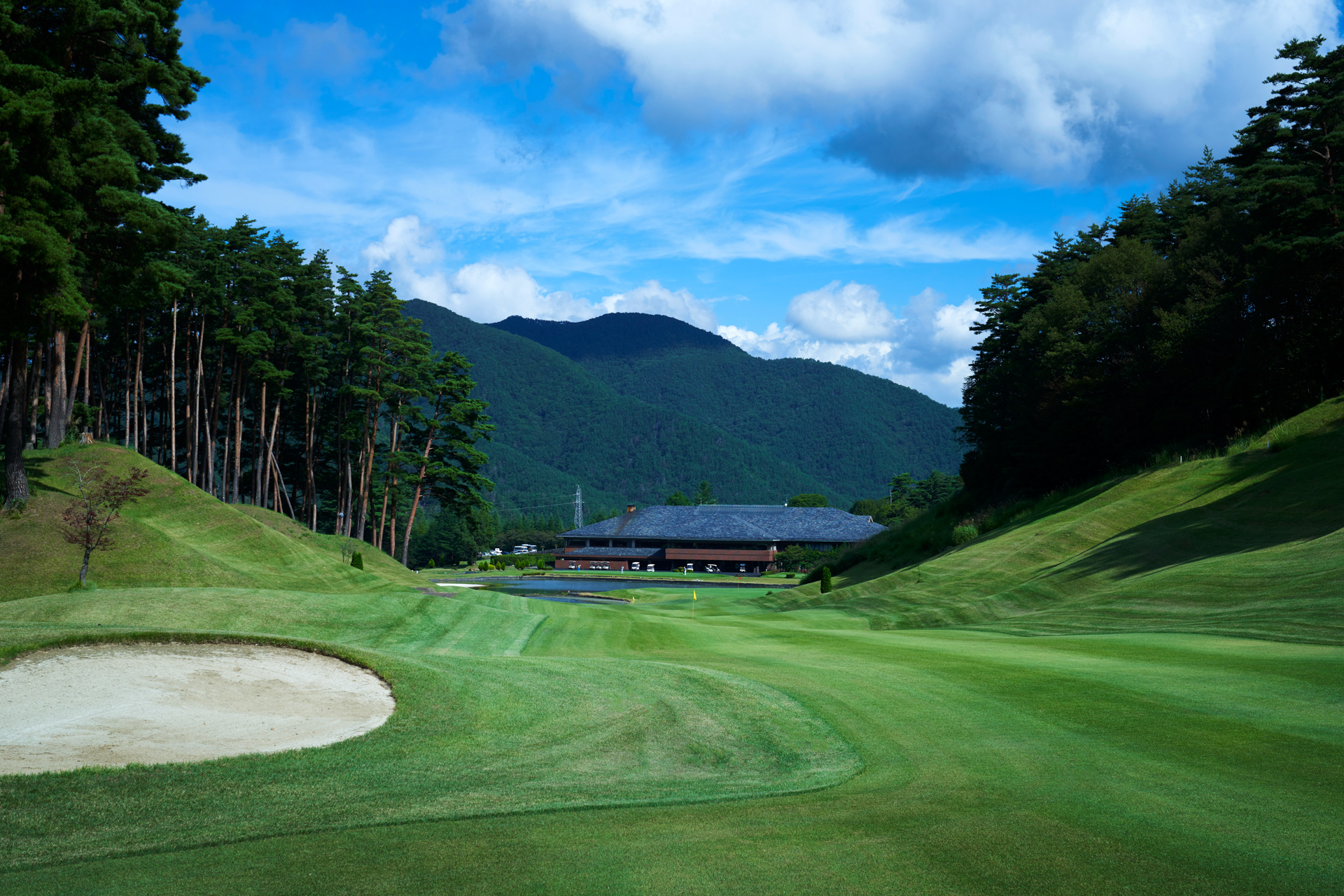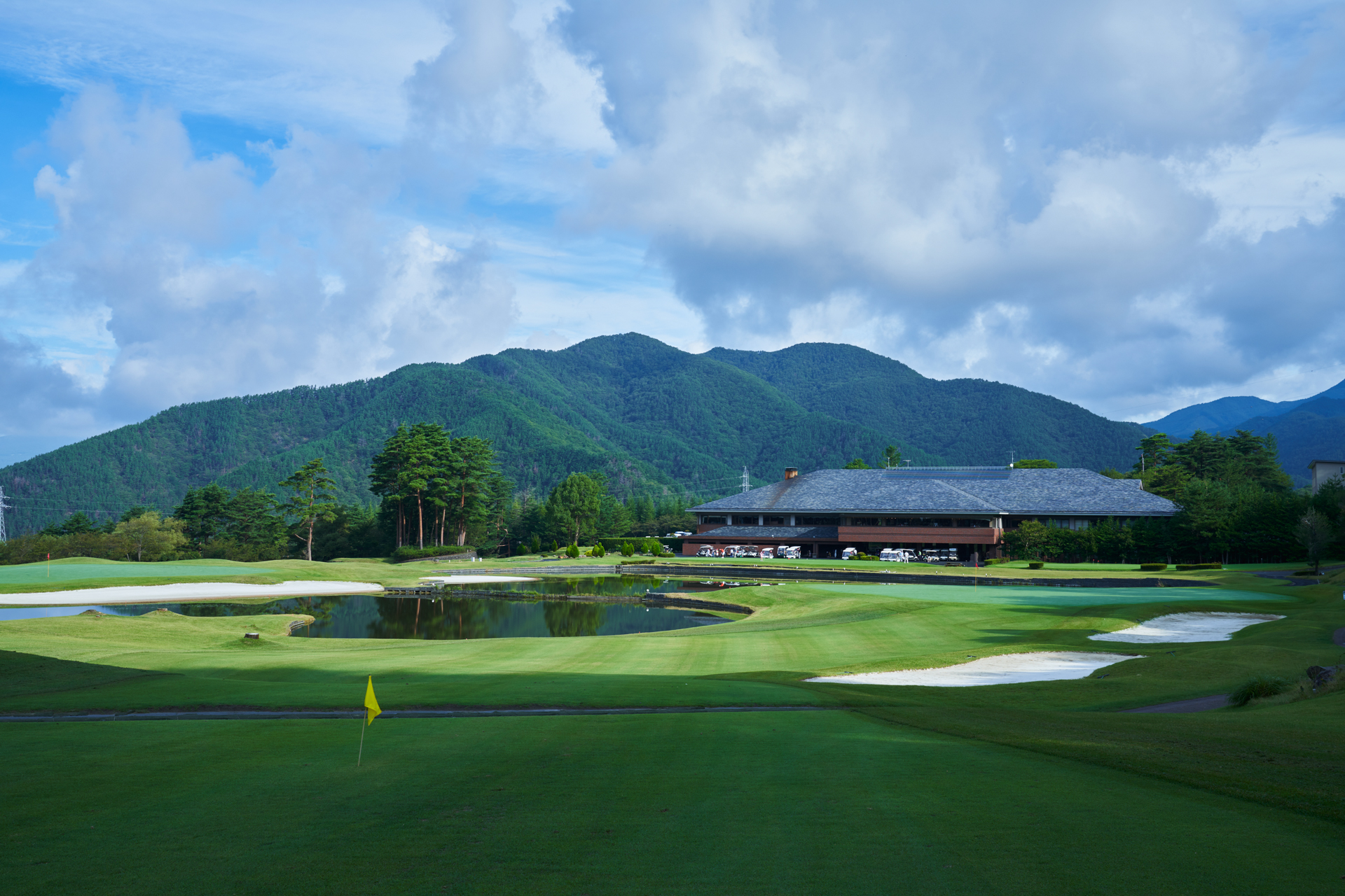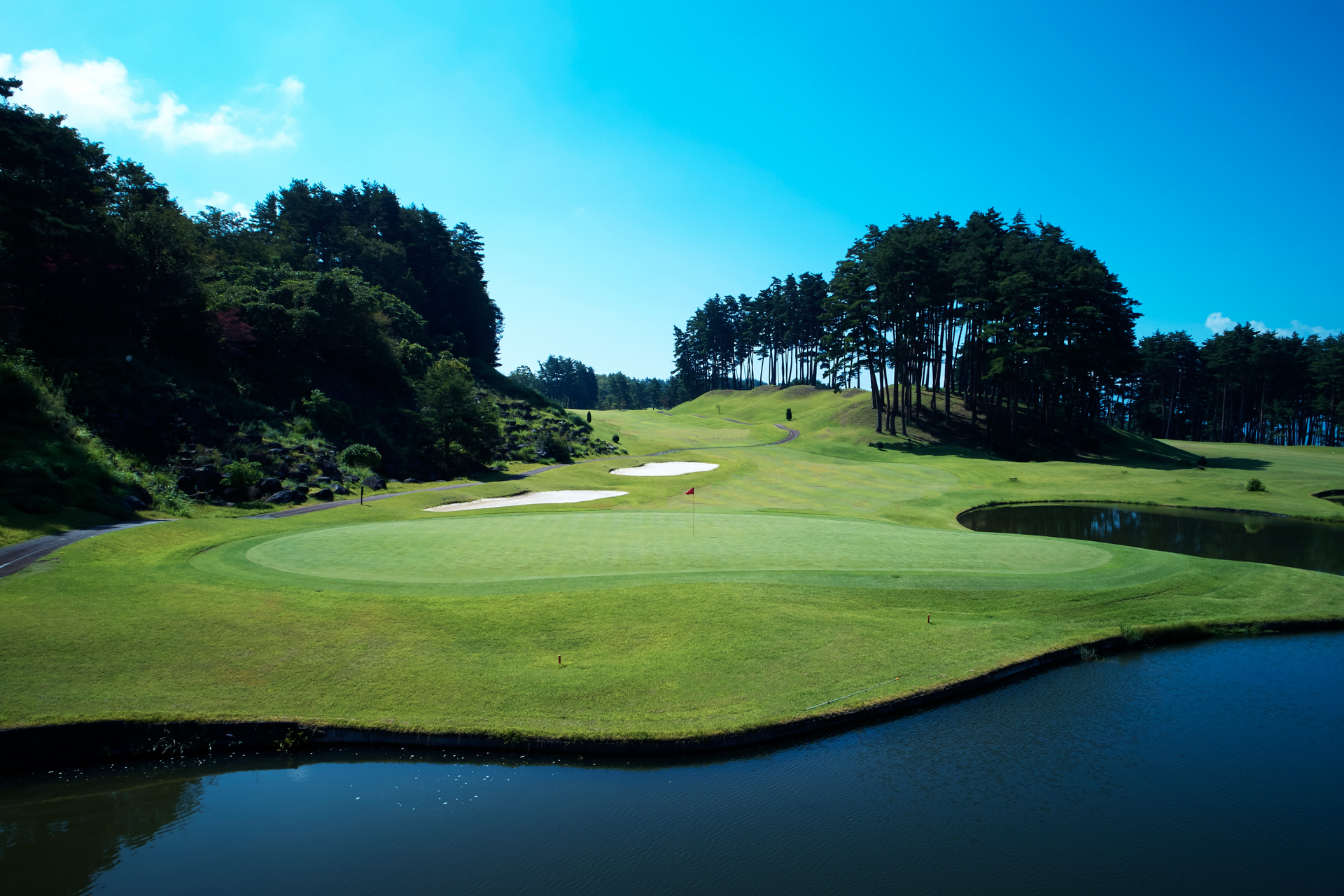 グリーン奥は、池ポチャ。手前から攻めましょう。
